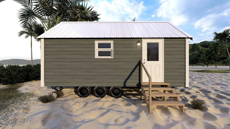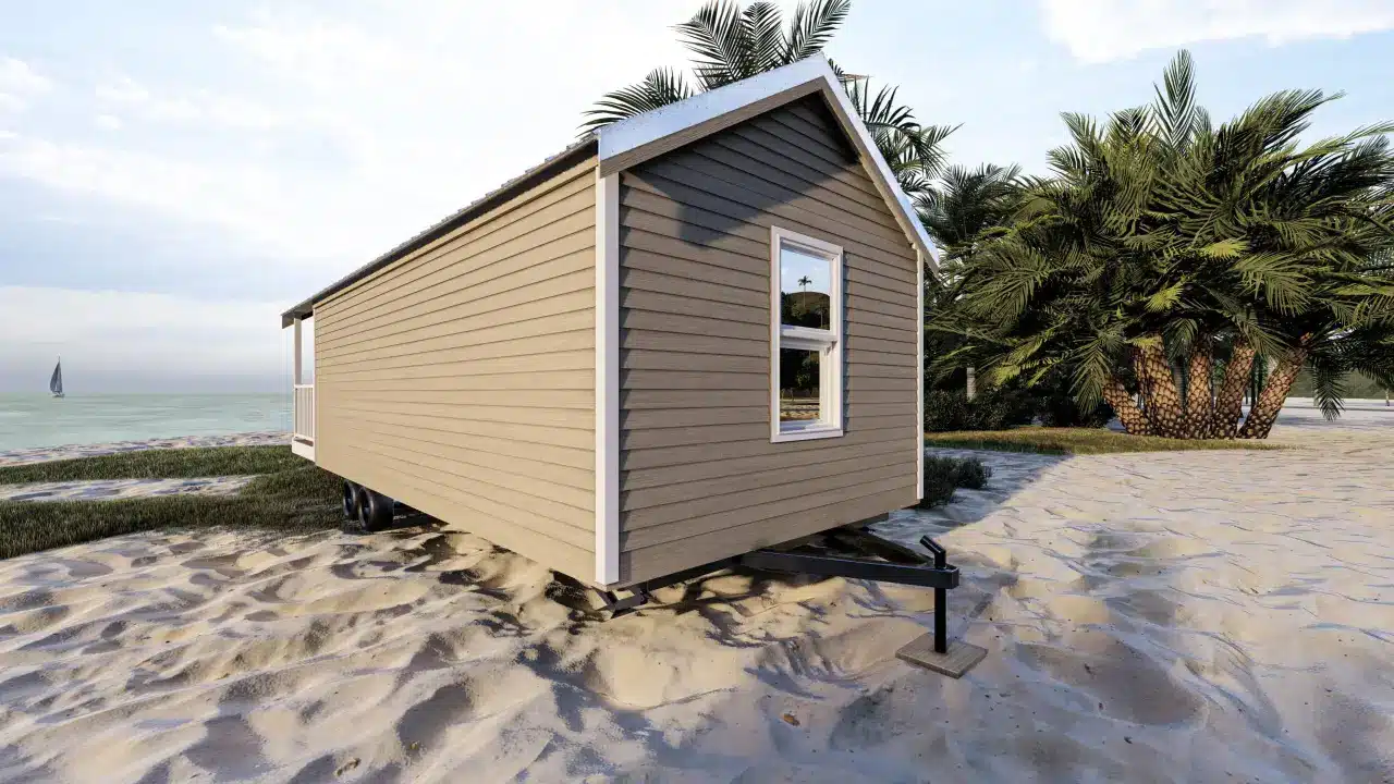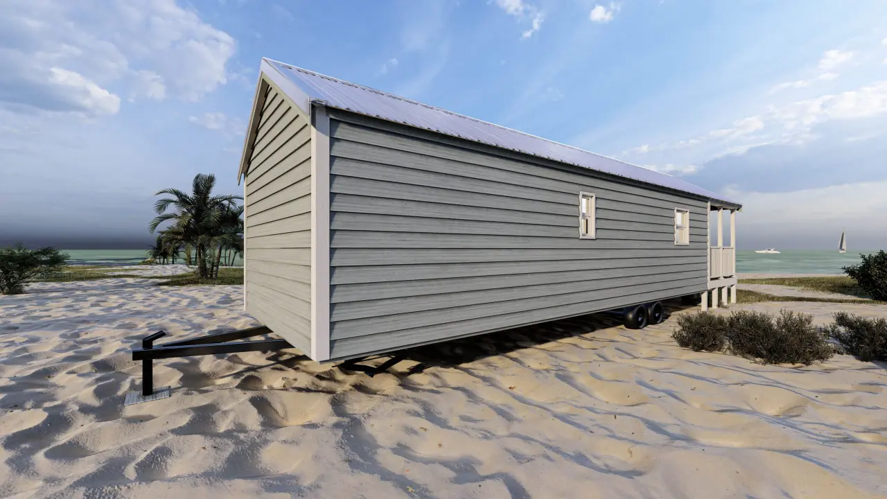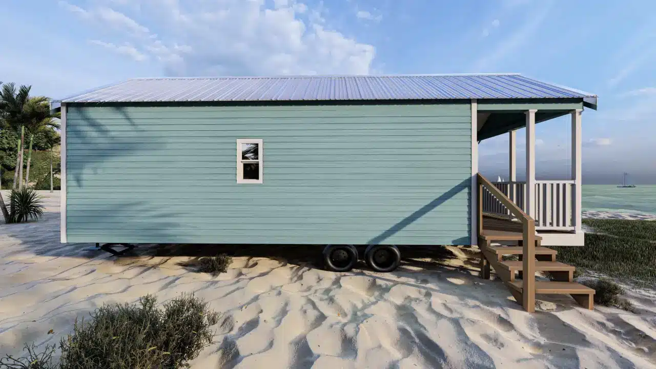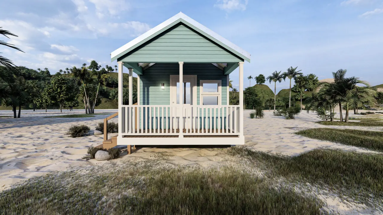 Stylish, comfortable & colorful cottage w/ beach-inspired hues. Comes w/ modern interiors in clean vinyl sheetrock. Built on steel I-beam chassis w/ removable hitch, solid wood cabinets, Low-E vinyl windows, & durable fiber cement siding.