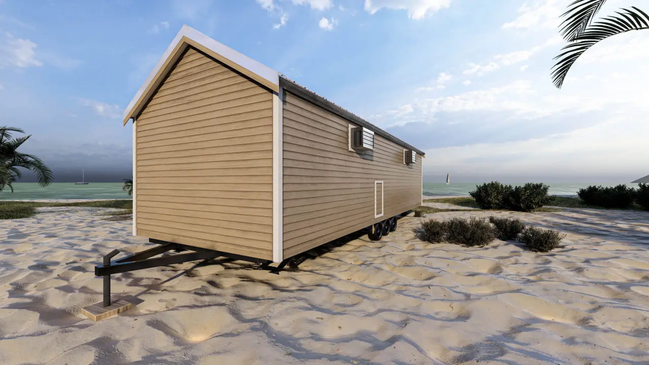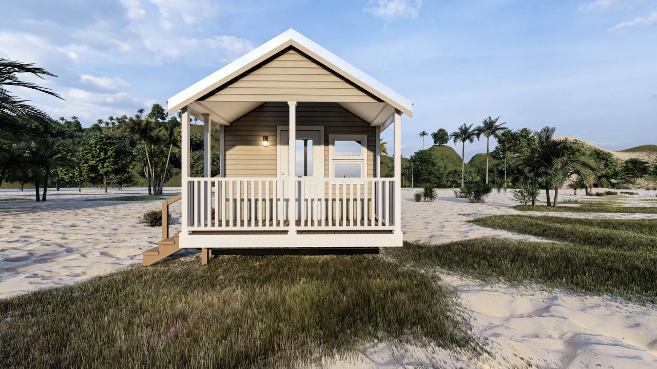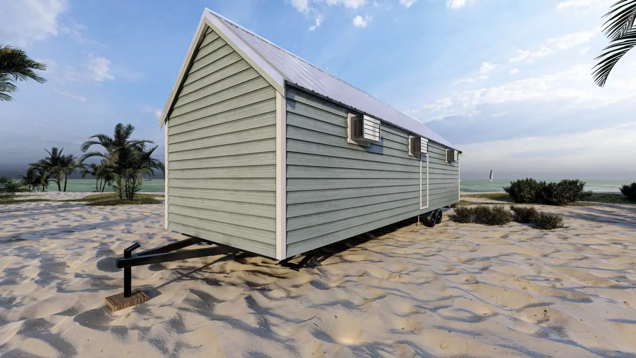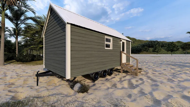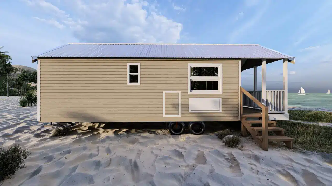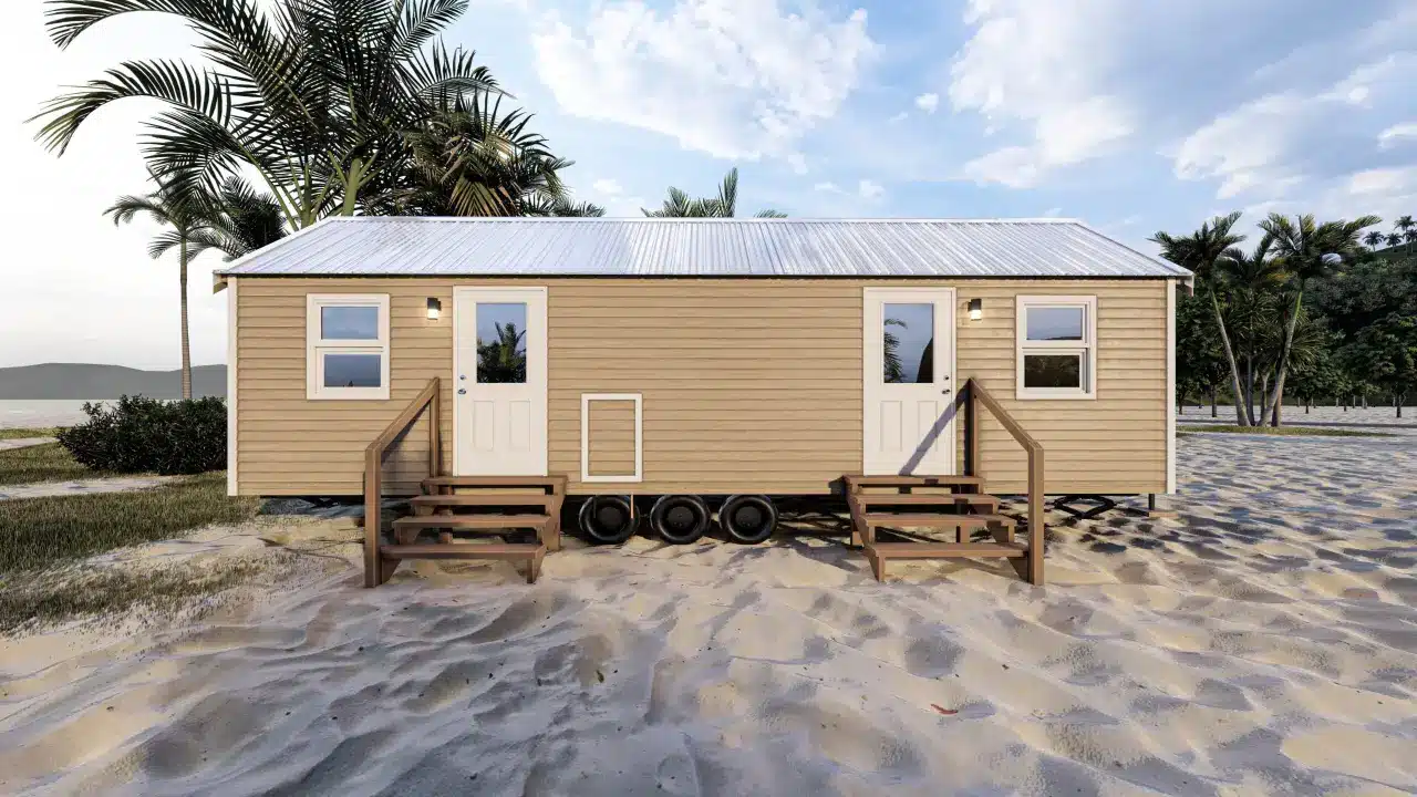 Stylish, comfortable & colorful cottage w/ beach-inspired hues. Comes w/ modern interiors in clean vinyl sheetrock. Built on steel I-beam chassis w/ removable hitch, solid wood cabinets, Low-E vinyl windows, & durable fiber cement siding.