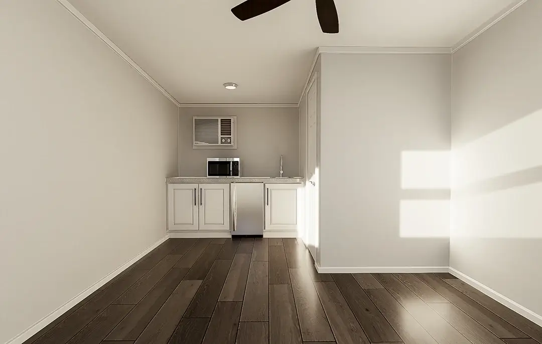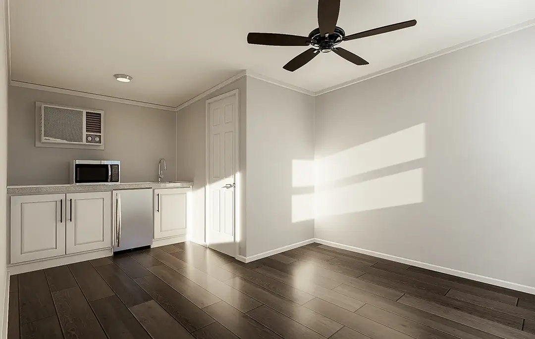 Measuring 12 feet by 16 feet with a ceiling height of 7 to 8 feet, the Tiny Home meets the minimum OSHA space requirement for staff housing. Carefully built according to the ANSI 119.5 Park Model RV standards, but without a chassis and wheels, campground and resort owners can rest easy knowing that their staff reside in a secure, on-site, and comfortable environment.
